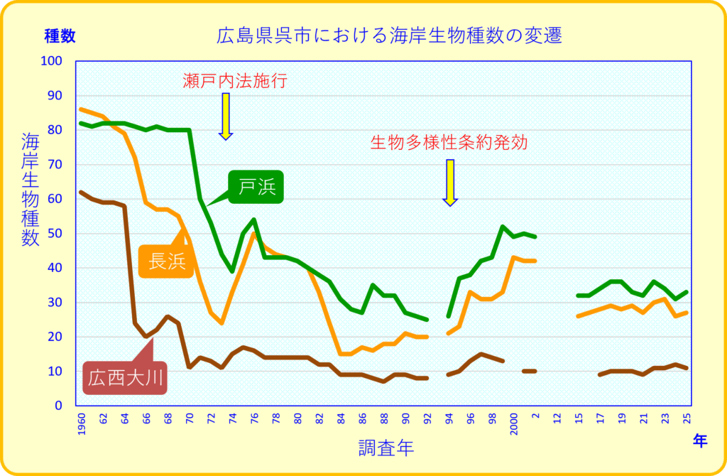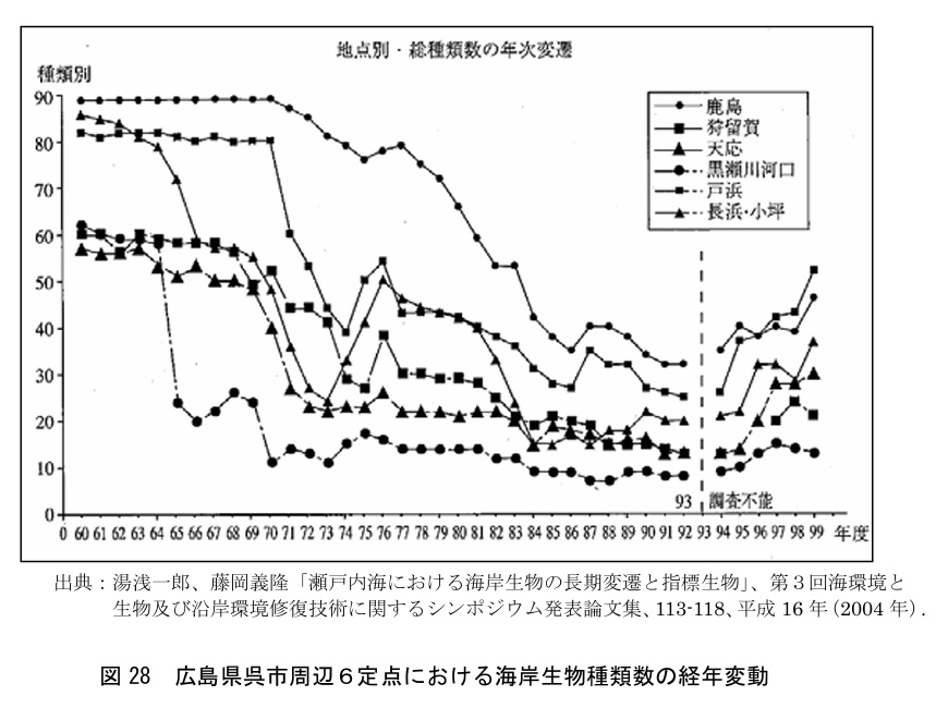 「数少ない長期的な観測がなされた広島県呉市における海岸小動物の種類数の経年変化では、昭和35年(1960年)度から平成2年(1990年)度にかけて種類数が著しく減少したが、平成6年(1994年)度以降に回復の傾向が見られている。しかし、昭和35年(1960年)度と比較すると依然として低いレベルである。」(答申7ページ)